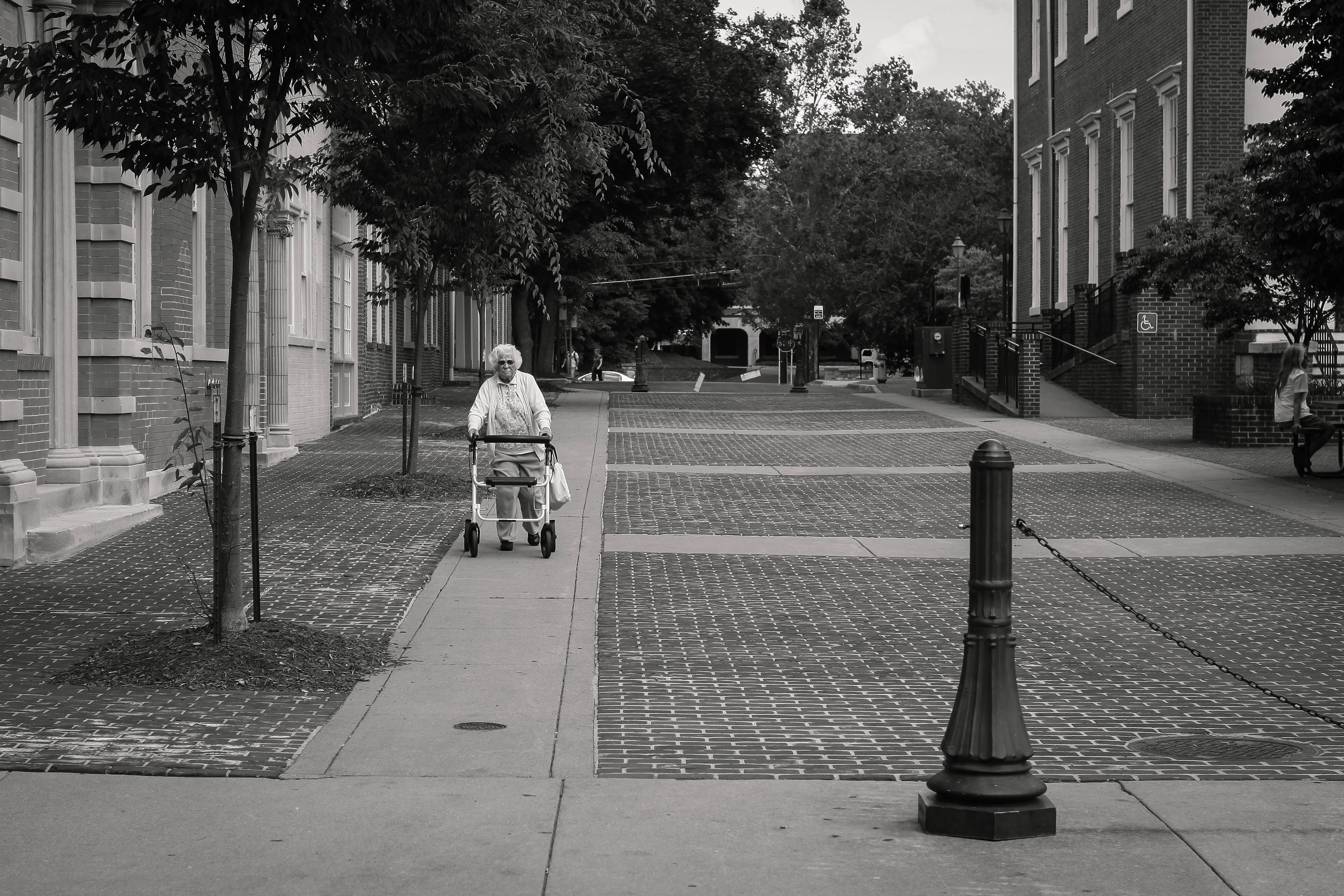An elderly woman navigates a quiet, dimly lit street using a walker, embodying resilience amidst solitude. The monochrome palette enhances the sense of stillness and reflection, with trees lining the path and historic buildings framing the scene. The composition draws the eye along the cobbled walkway, inviting contemplation on the passage of time and the strength of spirit.
