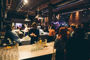 The photograph captures a lively gathering in an industrial-style venue, filled with people enjoying a vibrant atmosphere. Warm lighting highlights the busy bar as a bartender prepares drinks amidst a crowd engaged in conversation, evoking a sense of joy and connection. The composition balances the energetic crowd with the inviting, well-lit bar area, inviting viewers into the celebration.