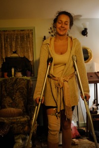 A young woman stands confidently with crutches, a warm smile illuminating her face amidst dim, cozy lighting. Draped in a soft, beige cardigan, she conveys a mix of strength and vulnerability, her bandaged knee visible yet understated. The surrounding environment, with hints of homey decor, adds a layer of intimacy to the moment captured.