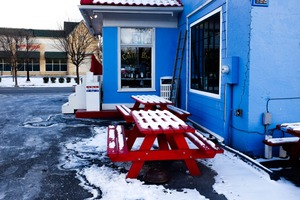 The photograph captures a vibrant blue coffee bar nestled in a wintry landscape, with red picnic tables partially dusted with snow. The contrast of colors creates a cozy yet striking mood, inviting warmth against the cold surroundings. Soft lighting enhances the inviting atmosphere, while the empty tables suggest a tranquil moment waiting for customers to enjoy a warm drink.