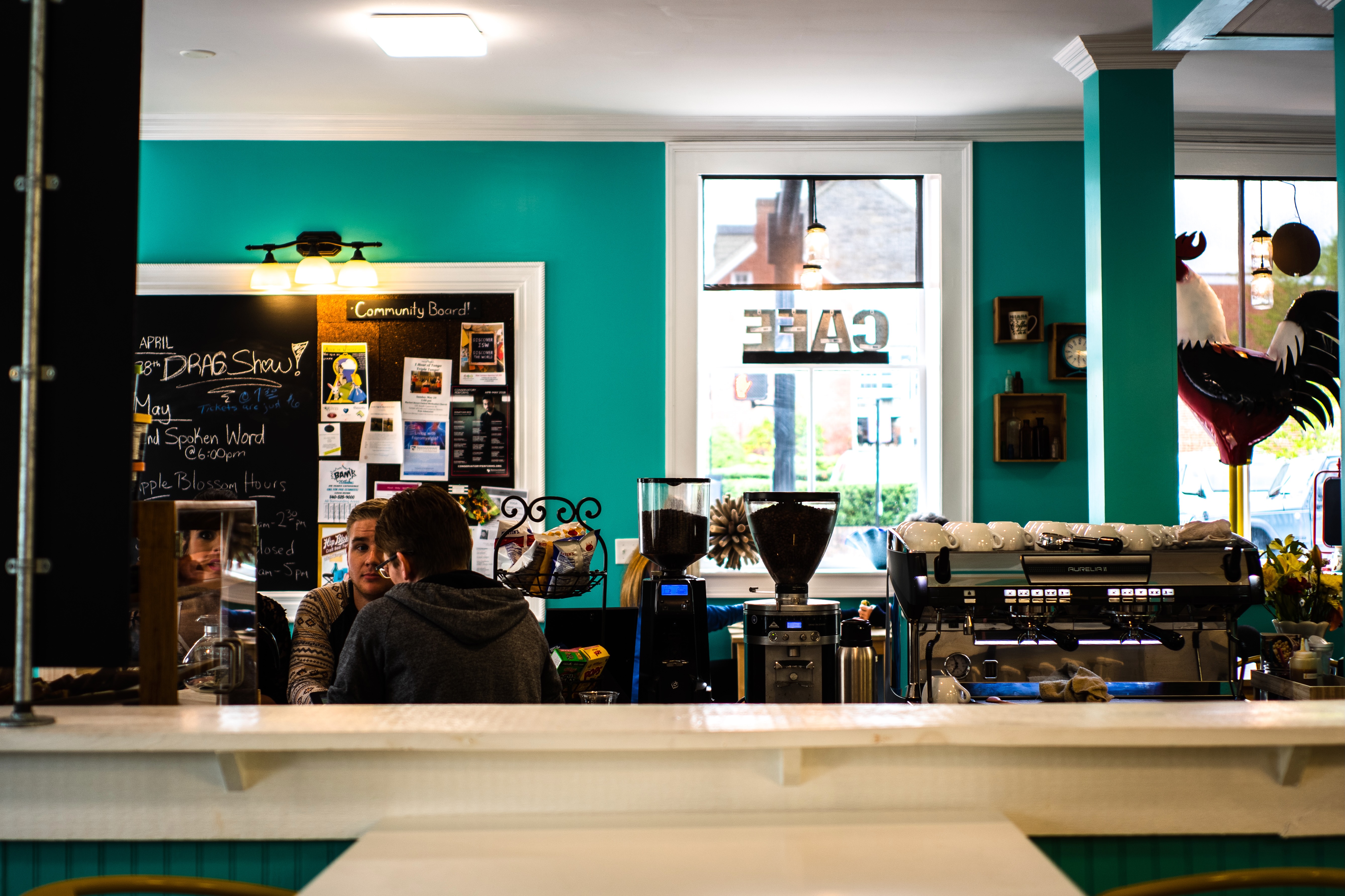 In a vibrant, teal-walled cafe, two patrons converse closely at the counter, immersed in a shared moment of connection. The inviting light spills in through the window, highlighting the array of colorful decor and creating a warm, cheerful ambiance. Coffee machines and assorted knick-knacks frame the scene, adding to the cozy, intimate atmosphere of the space.