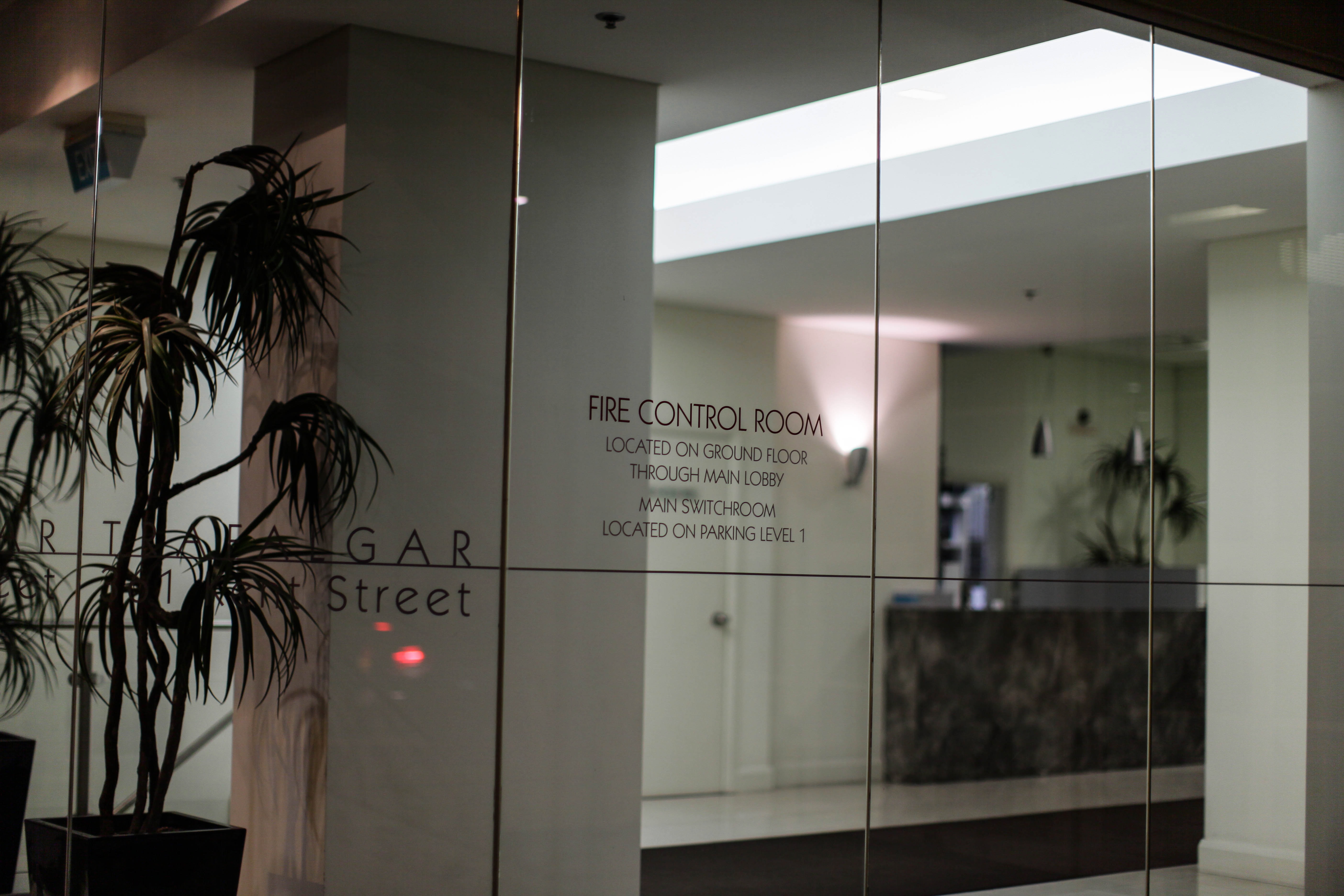 This photograph captures a quiet corner of a modern building, highlighting a glass door marked with essential safety information. Soft, ambient lighting filters through, creating a serene atmosphere, while the greenery adds a touch of tranquility. The composition draws the viewer into a space that balances functionality with an understated elegance.