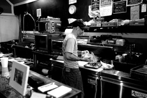 In a bustling eatery, a solitary figure diligently prepares a meal, surrounded by the warm clutter of kitchen equipment and ingredients. The stark black-and-white composition emphasizes the focus on the chef's concentration and the inviting chaos of culinary creation. Soft overhead lighting casts gentle shadows, creating a nostalgic, intimate atmosphere that captures the essence of a working kitchen.