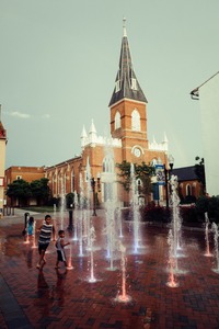 In this vibrant scene, two children joyfully play in a colorful splash fountain against the backdrop of a striking brick church tower. The warm evening light and gentle rain create a playful atmosphere, reflecting off the wet cobblestones. A hint of a rainbow adds to the enchanting mood, inviting viewers to bask in the simple pleasures of childhood.