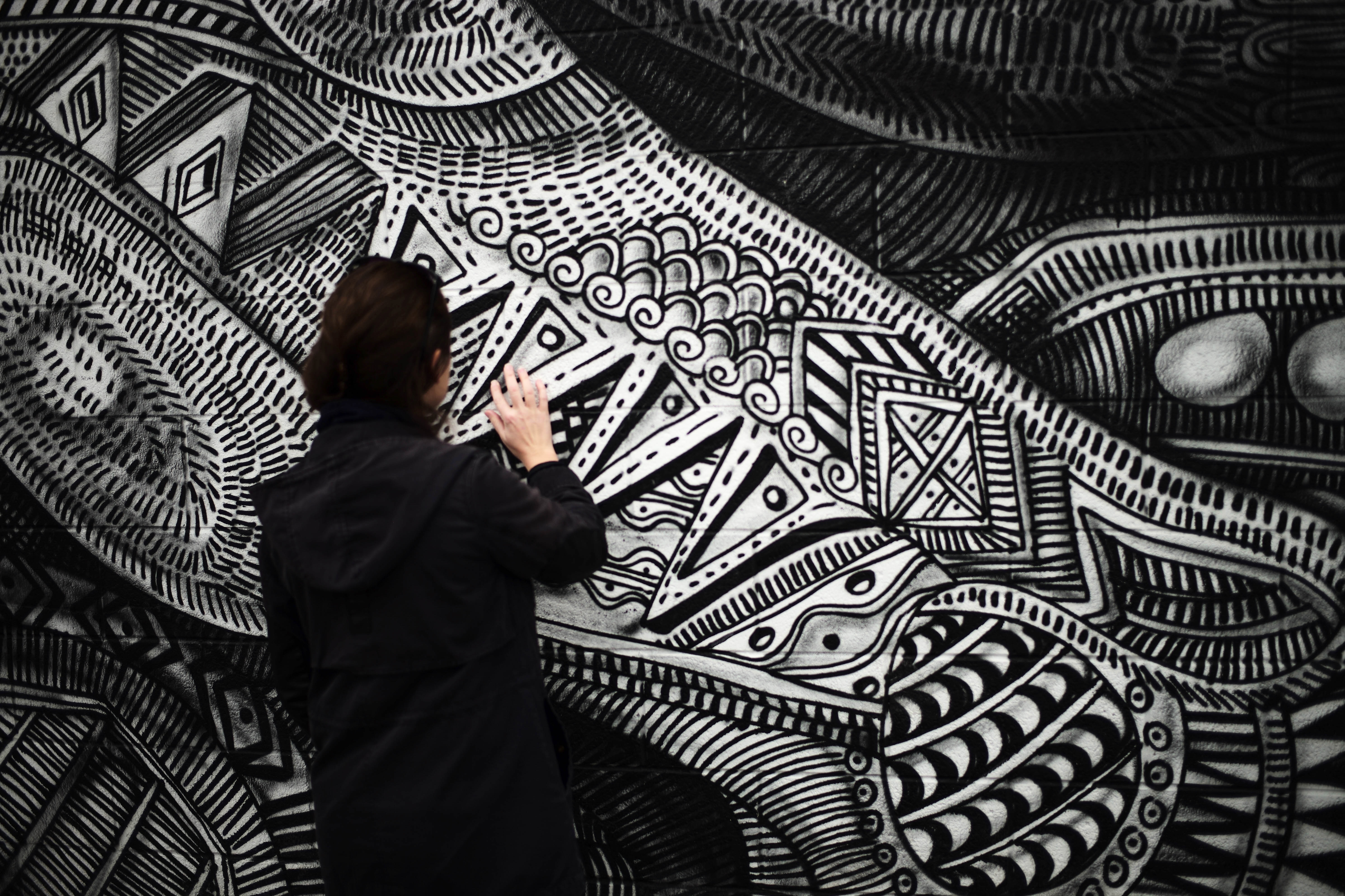 A solitary figure is captured in the act of engaging with a striking black and white mural, their hand poised thoughtfully against the textured surface. The moody atmosphere is accentuated by soft lighting, emphasizing the intricacies of the artwork and creating a contemplative ambiance. The composition draws the eye towards the dynamic patterns of the mural, merging human creativity with striking artistry.