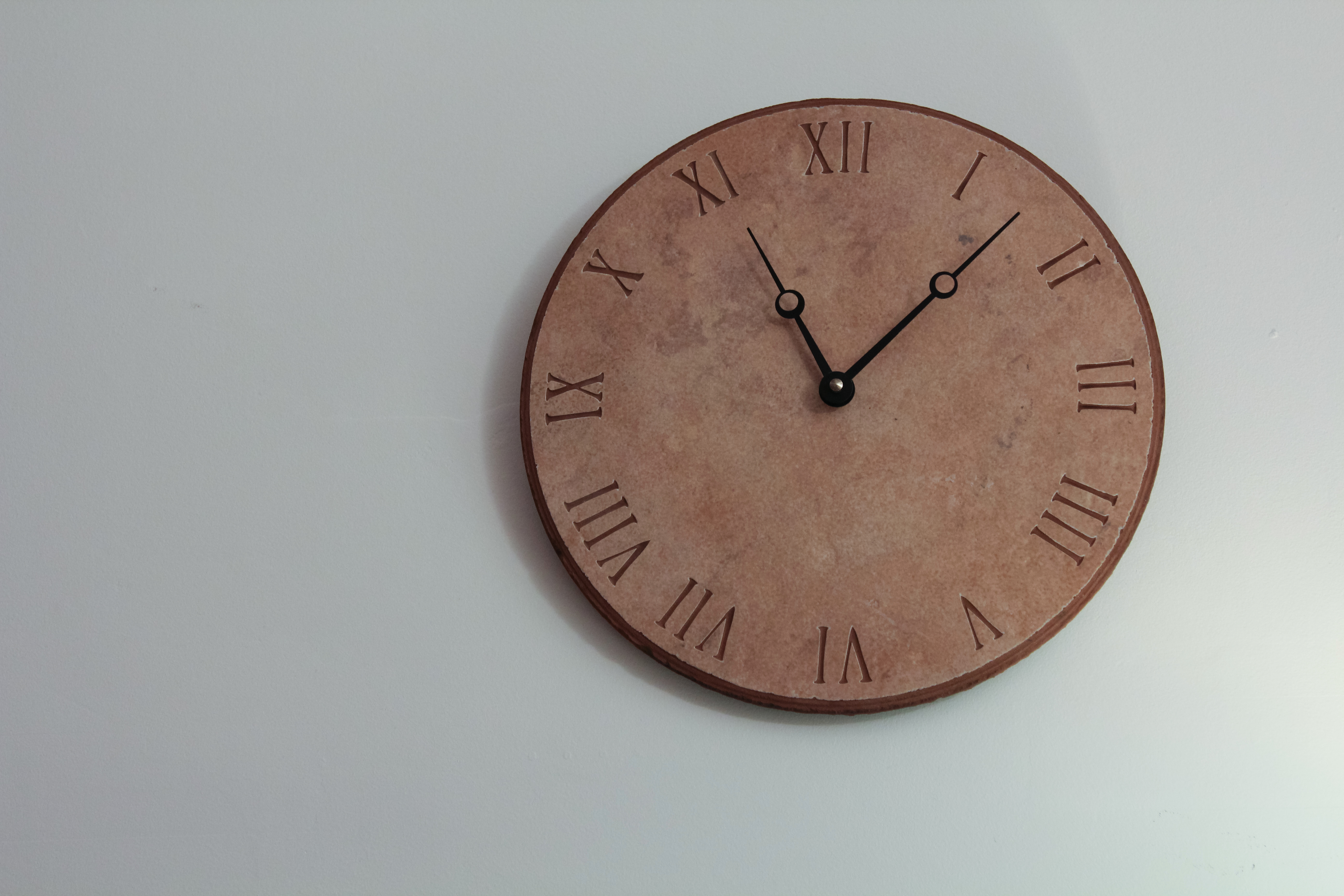 A striking wall clock hangs against a soft white backdrop, exuding a warm and minimalistic charm. The clock's earthy tones and Roman numerals evoke a sense of classic sophistication, while the subtle shadows suggest a quiet, introspective mood. With the hands gently poised, it invites contemplation of time in its purest form.