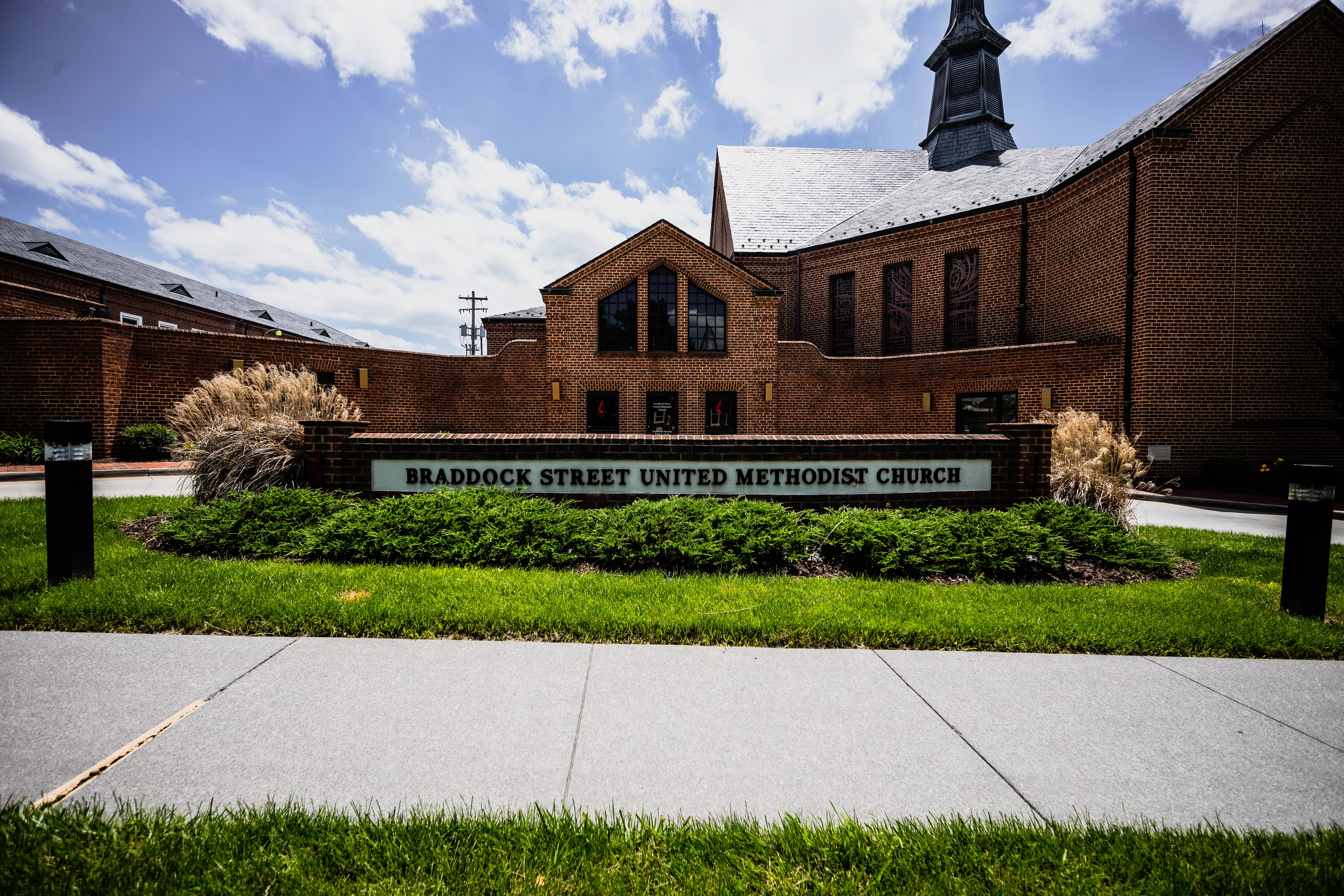 The photograph captures the Braddock Street United Methodist Church, showcasing its striking red brick facade under a bright blue sky. Lush greenery and well-maintained landscaping frame the entrance, creating a welcoming atmosphere. The interplay of sunlight and shadows adds depth to the composition, evoking a sense of tranquility and community.