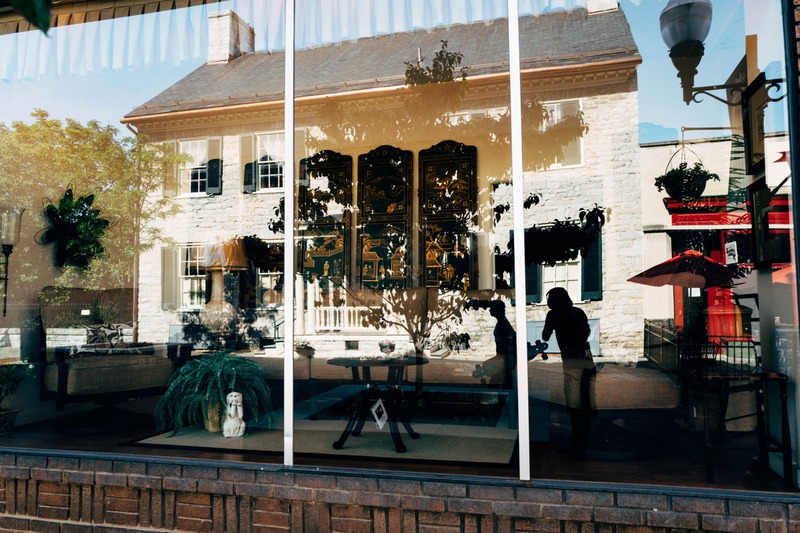 The photograph captures a dynamic interplay of reflections in a shop window, revealing both the interior decor and the charming architecture outside. Natural light bathes the scene, evoking a nostalgic mood, while the silhouettes of passersby hint at life beyond the glass. The composition balances the ornate furnishings with the rich textures of the building, creating a layered visual narrative.
