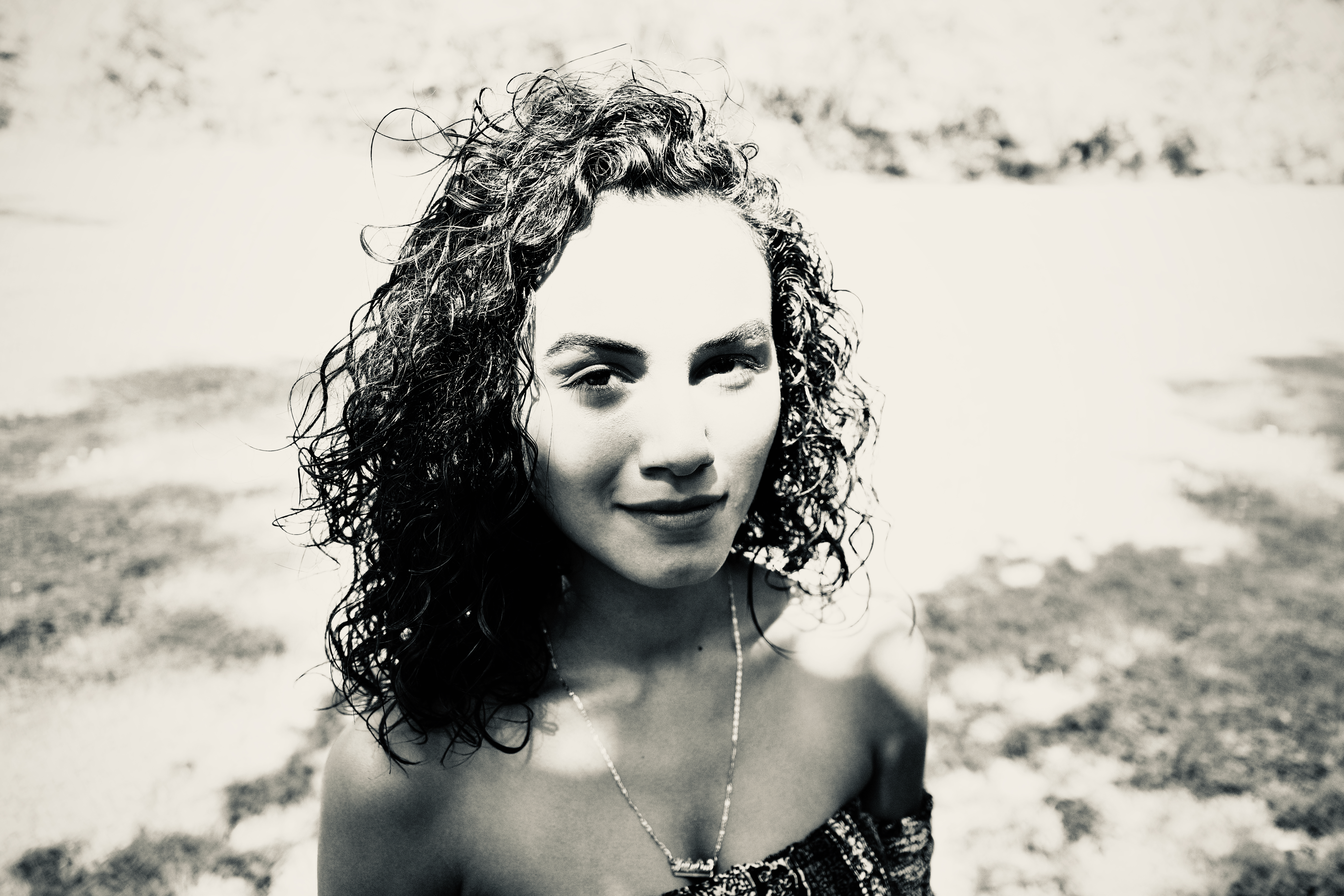 A young woman stands confidently in the foreground, her curly hair catching the soft light. The high contrast of the photo creates a striking mood, emphasizing her features against a blurry, sunlit background. Shadows and highlights play across her face, evoking a sense of warmth and intensity.