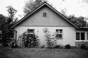 This photograph captures a modest house framed by lush greenery, exuding a tranquil and nostalgic atmosphere. The monochromatic tones enhance the serene mood, while the symmetrical composition invites the viewer's gaze to the quaint windows and growth surrounding the home. Soft light filters through, suggesting a peaceful afternoon, evoking a sense of calm and familiarity.