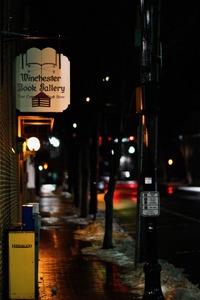 The dimly lit street showcases the inviting sign of the Winehester Book Gallery, casting warm light in contrast to the cool night atmosphere. Puddles reflect the sparse streetlights, enhancing a sense of tranquility and contemplation. Shadows dance among the trees lining the sidewalk, evoking a cozy yet mysterious ambience, perfect for wandering book lovers.