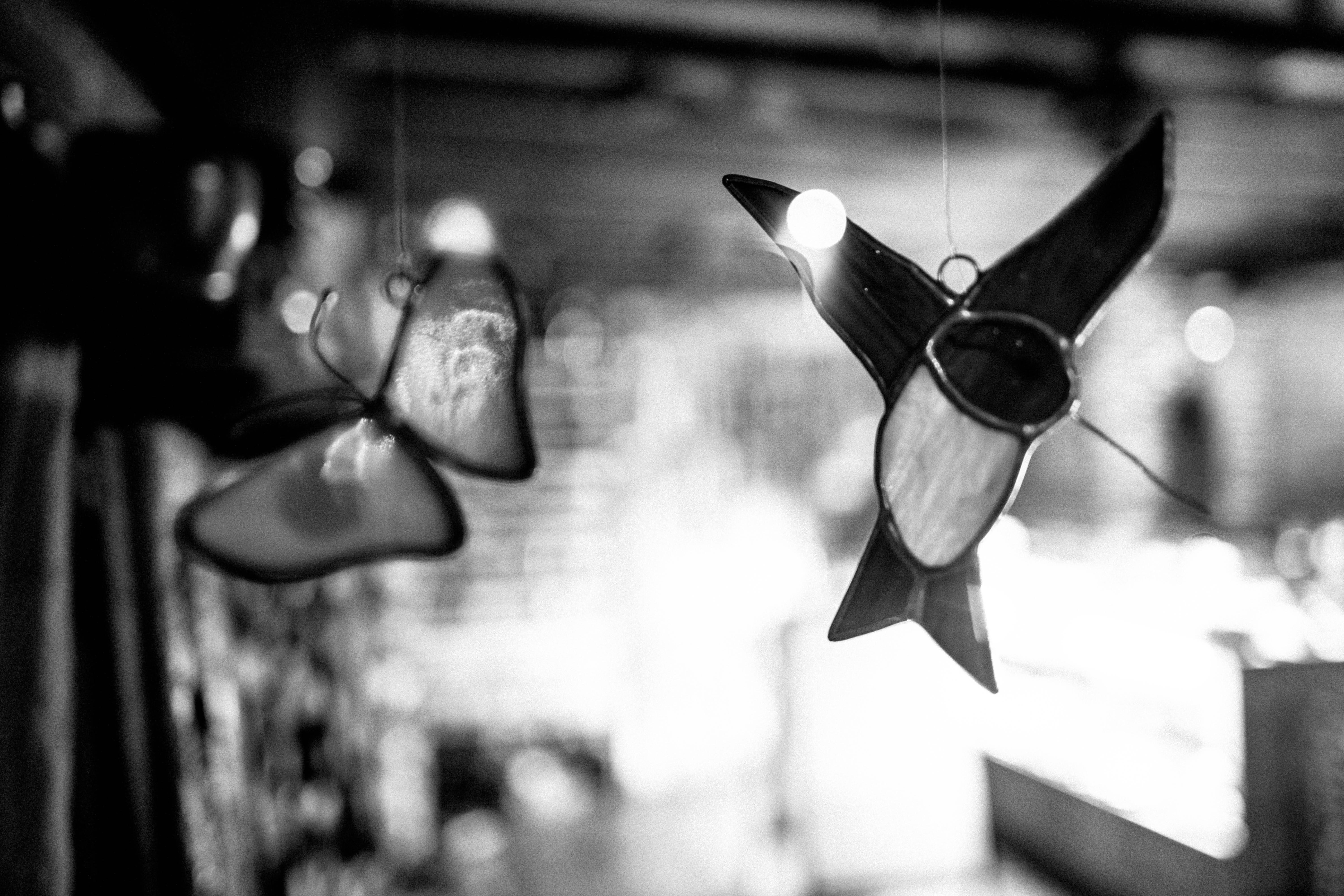 This black and white photograph captures delicate glass ornaments hanging in soft focus, evoking a sense of nostalgia. The muted light softly illuminates the forms, creating an ethereal mood that contrasts with the shadowy background. The composition draws the eye to the intricate details of the ornaments while the blurred surroundings add depth and intrigue.