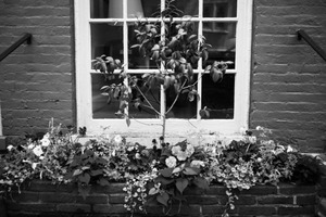This black-and-white photograph captures a quaint window adorned with a flourishing planter, showcasing a delicate balance between a small tree and an array of vibrant flowers. The soft light streaming through the window creates a serene atmosphere, highlighting the intricate textures of the leaves and petals. The composition draws the eye inward, inviting a sense of tranquility and connection to nature amidst the urban backdrop.