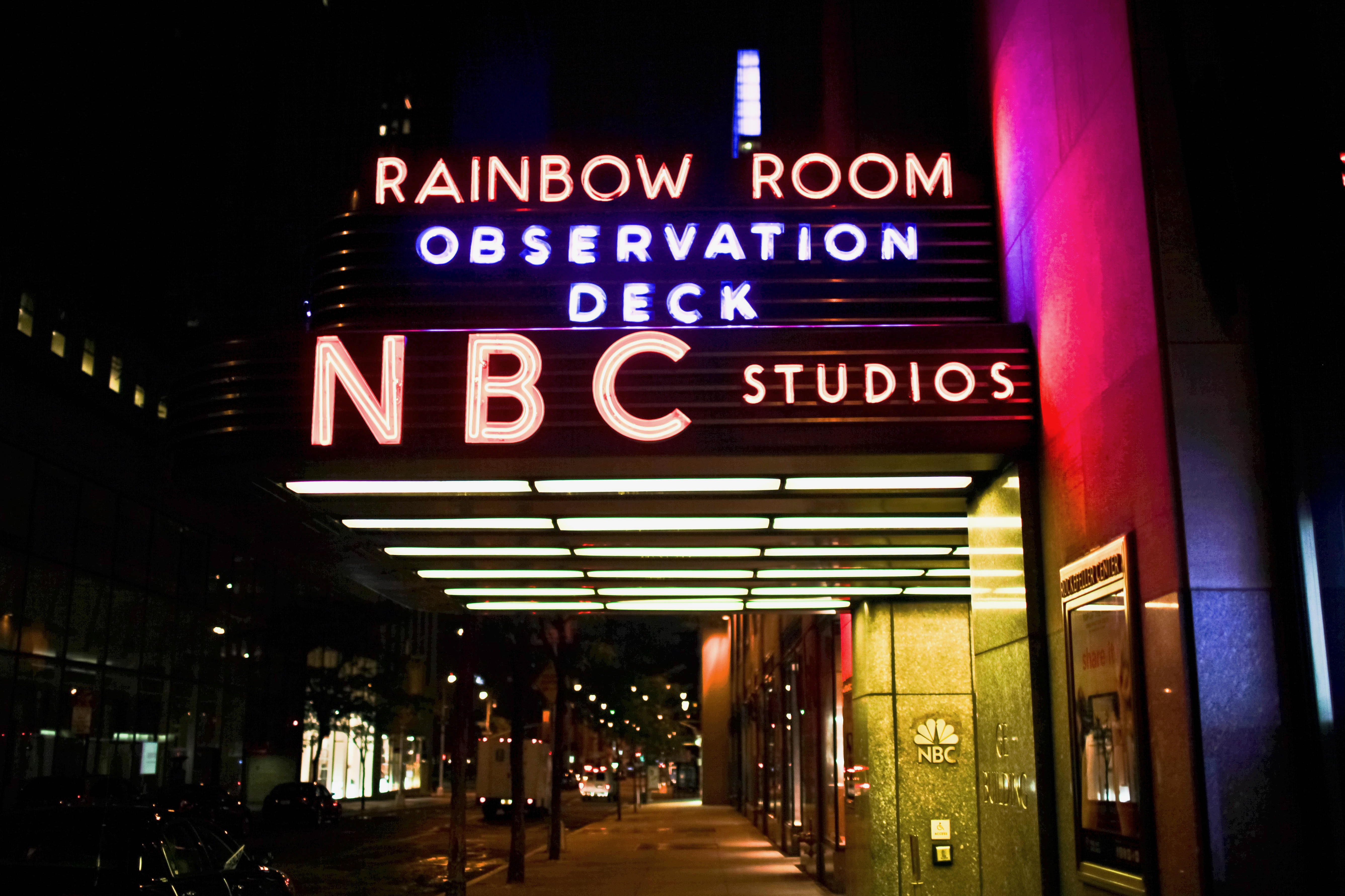 The photograph captures the vibrant neon signage of the Rainbow Room, an iconic part of NBC Studios, glowing against the dusky night sky. The moody lighting casts a warm glow on the urban setting, evoking a sense of nostalgia and excitement. The composition invites viewers to explore the bustling city life framed by the striking colors of the illuminated letters.
