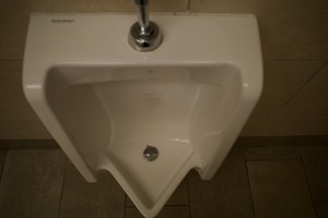 The photograph captures a solitary urinal from an overhead perspective, highlighting its minimalist design and stark white color against a muted tiled background. The soft lighting creates a discreet and somewhat somber mood, drawing attention to the simplicity and utilitarian purpose of the subject. The composition emphasizes clean lines and angles, evoking a sense of both anonymity and quiet reflection in an everyday environment.