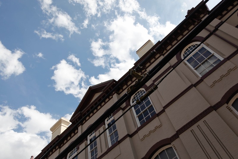 Captured from a low angle, this photograph presents a grand architectural facade against a vibrant blue sky dotted with wispy clouds. The interplay of light highlights the building's intricate details and contrasting colors, evoking a sense of elegance and historical charm. The upward perspective invites a feeling of admiration and wonder, transforming the ordinary into the extraordinary.