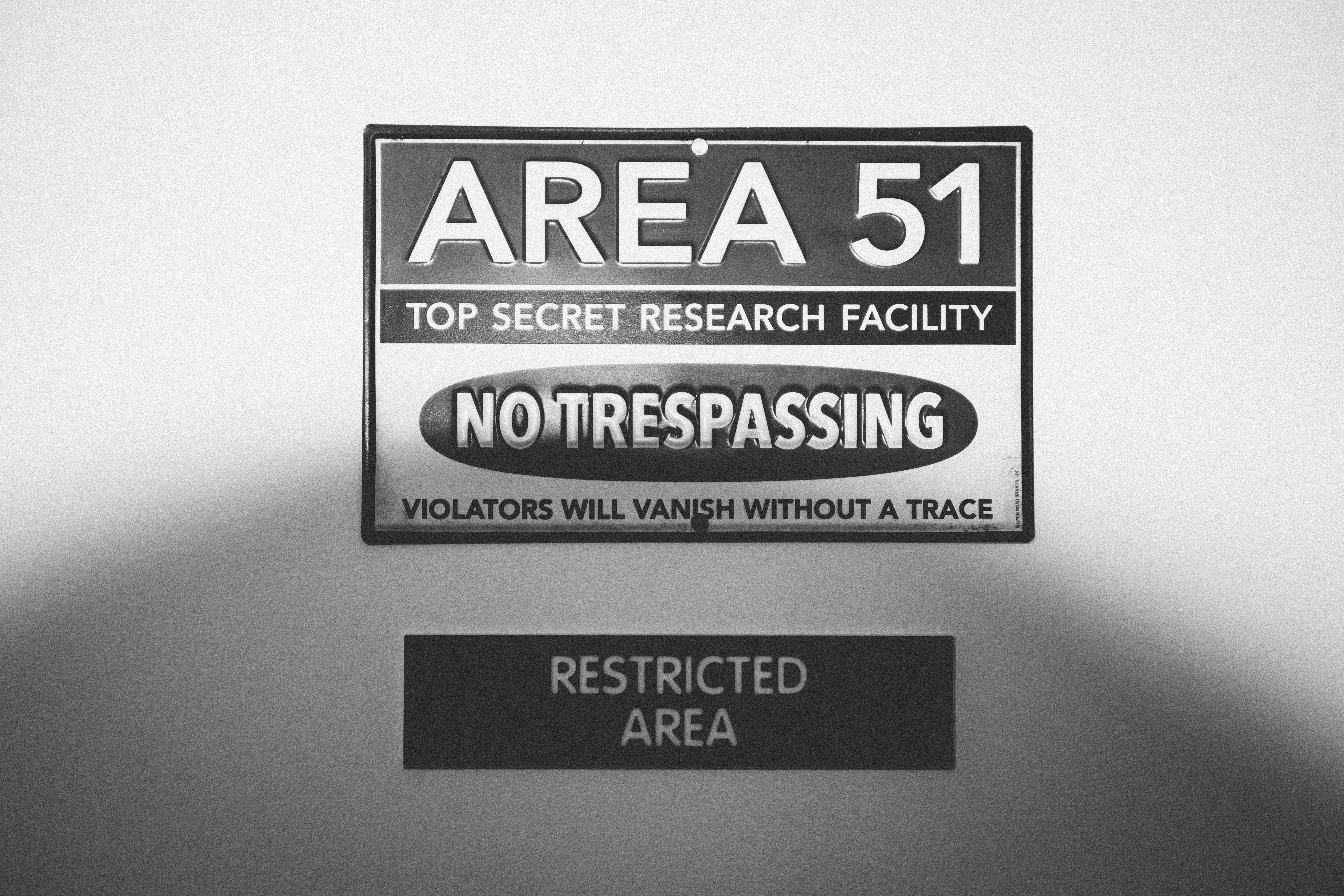 This photograph captures a striking sign warning against trespassing in a restricted area, shrouded in mystery. The high-contrast black and white composition emphasizes the stark seriousness of the message, evoking intrigue and caution. The selective focus on the sign, enhanced by dramatic lighting, creates an atmosphere of secrecy and tension.