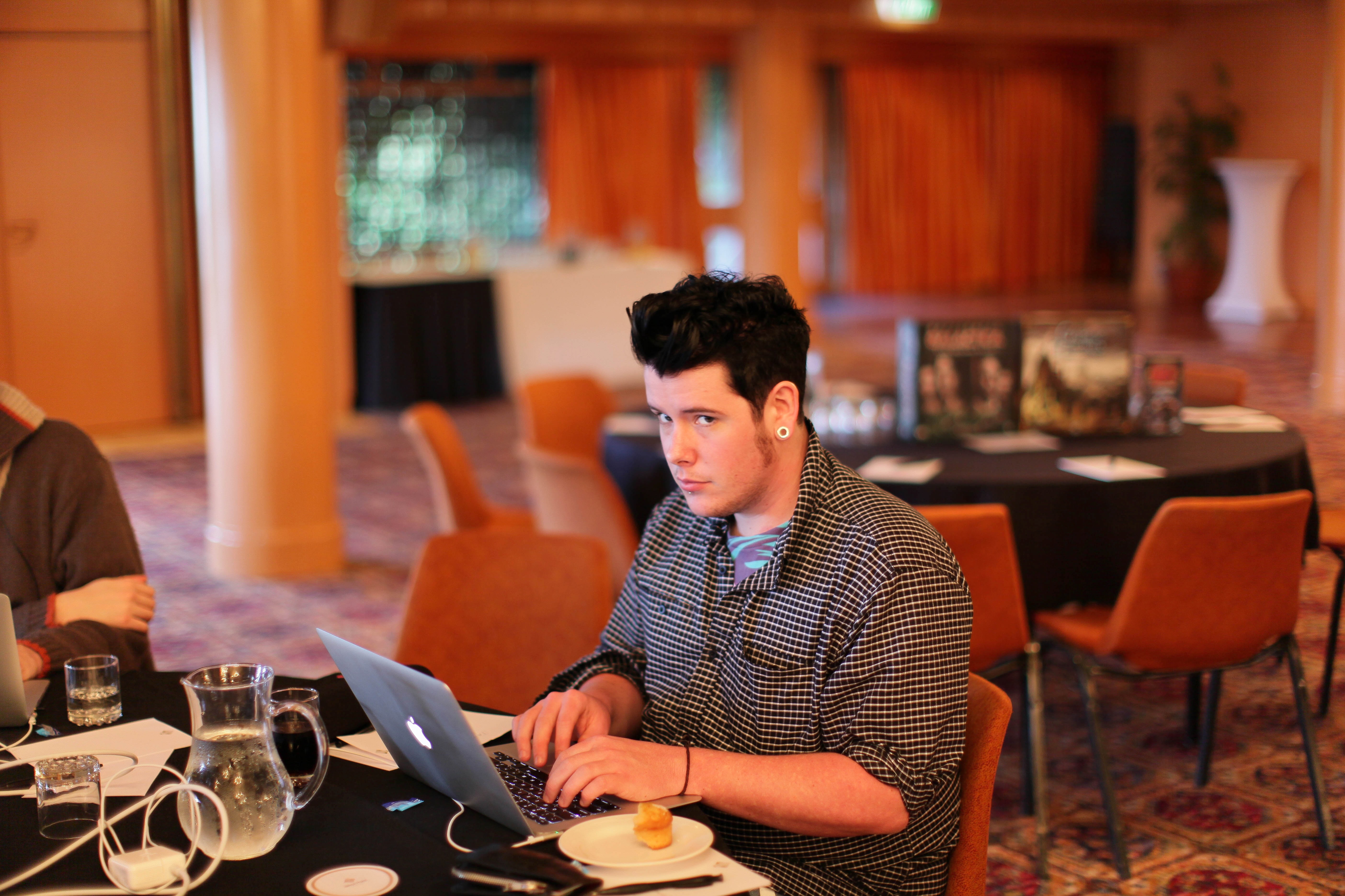 A young man sits at a round table, intently typing on his laptop amid a softly lit conference setting. The warm tones of the room contrast with his focused expression, while the scattered items on the table hint at a productive atmosphere. The blurred background further emphasizes his dedication, creating an intimate snapshot of concentration and creativity.