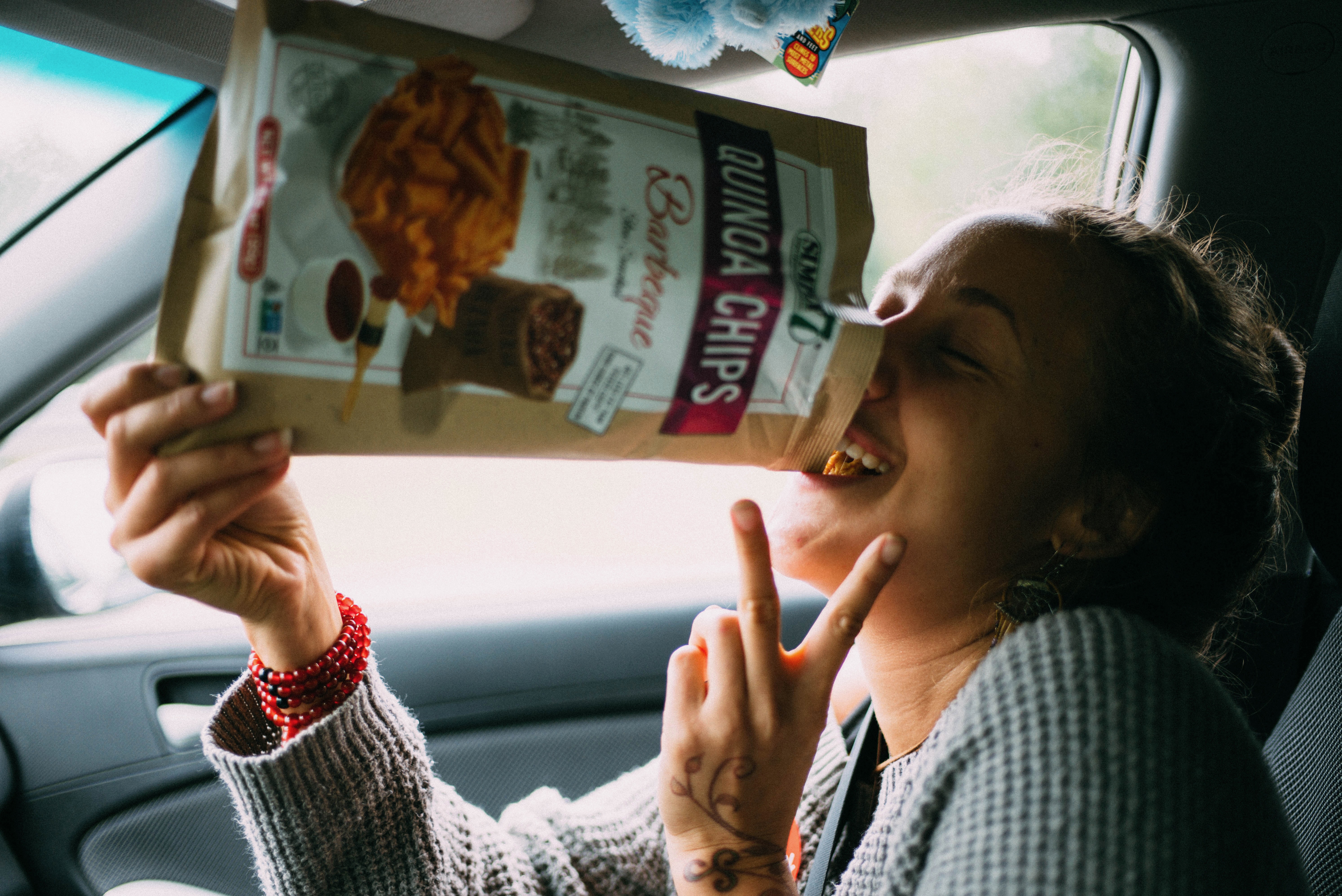 In a cozy car interior, a young woman indulges in quinoa chips with a playful expression, embodying a carefree spirit. The soft, natural light filtering through the window enhances the relaxed mood, while her vibrant accessories add a touch of personal style. The composition captures the intimate moment of enjoyment, as she playfully poses with the snack, making it feel spontaneous and joyful.