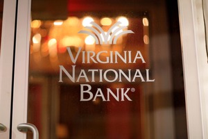The photograph captures the entrance of Virginia National Bank, with its logo prominently displayed against a glass door. Soft, diffused lighting creates a warm ambiance, while the blurred background hints at a luxurious interior, suggesting prosperity and comfort. The composition emphasizes clarity in the foreground contrasted with the inviting, dreamy glow of lights in the backdrop.