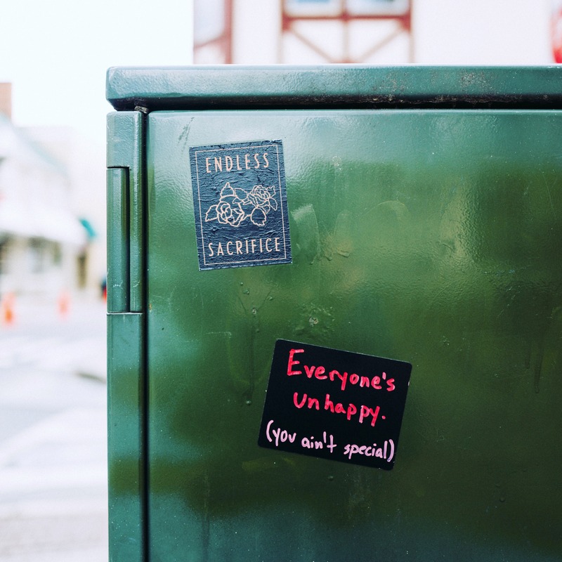 This photograph captures a weathered green utility box adorned with two contrasting stickers. The bold messages create a poignant commentary on shared human struggles, enhanced by soft, natural lighting that lends an introspective mood to the urban scene.