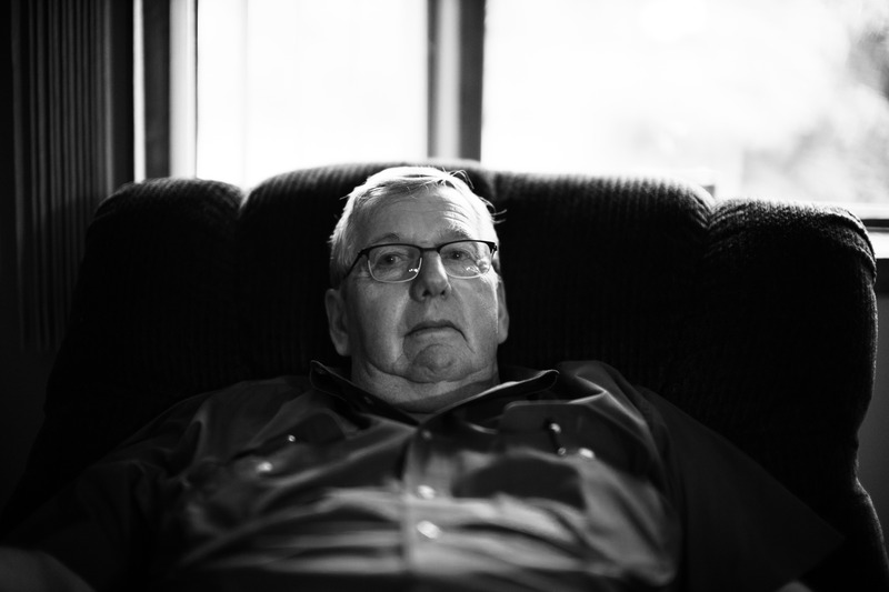 The photograph captures an older man seated in a dimly lit room, his expression reflecting deep contemplation. Soft natural light filters in from a window, casting gentle shadows that enhance the mood of introspection. The composition focuses on the subject, emphasizing his calm demeanor amidst a serene setting.