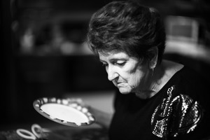 This black-and-white photograph captures an elderly woman deeply absorbed in thought while holding a paper plate. The soft lighting casts gentle shadows, enhancing the calm and introspective mood of the scene. The blurred background emphasizes her focused expression, creating an intimate atmosphere that invites reflection on memory and connection.