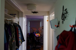 A dimly lit hallway invites intrigue, lined with casual clothing and homey details. The warm glow of a computer screen at the end hints at a lived-in space, creating a cozy yet chaotic atmosphere. Playful decorations like the pumpkin and bat add character, balancing the everyday with a touch of whimsy.
