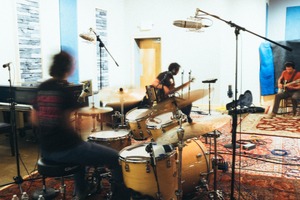 In a cozy recording studio, musicians are captured mid-performance, with a blurred drummer passionately engaged in their craft. The warm lighting casts an inviting atmosphere, while colorful rugs and instruments evoke a sense of creative chaos. The dynamic composition hints at the energy and spontaneity of live music, drawing the viewer into the moment.