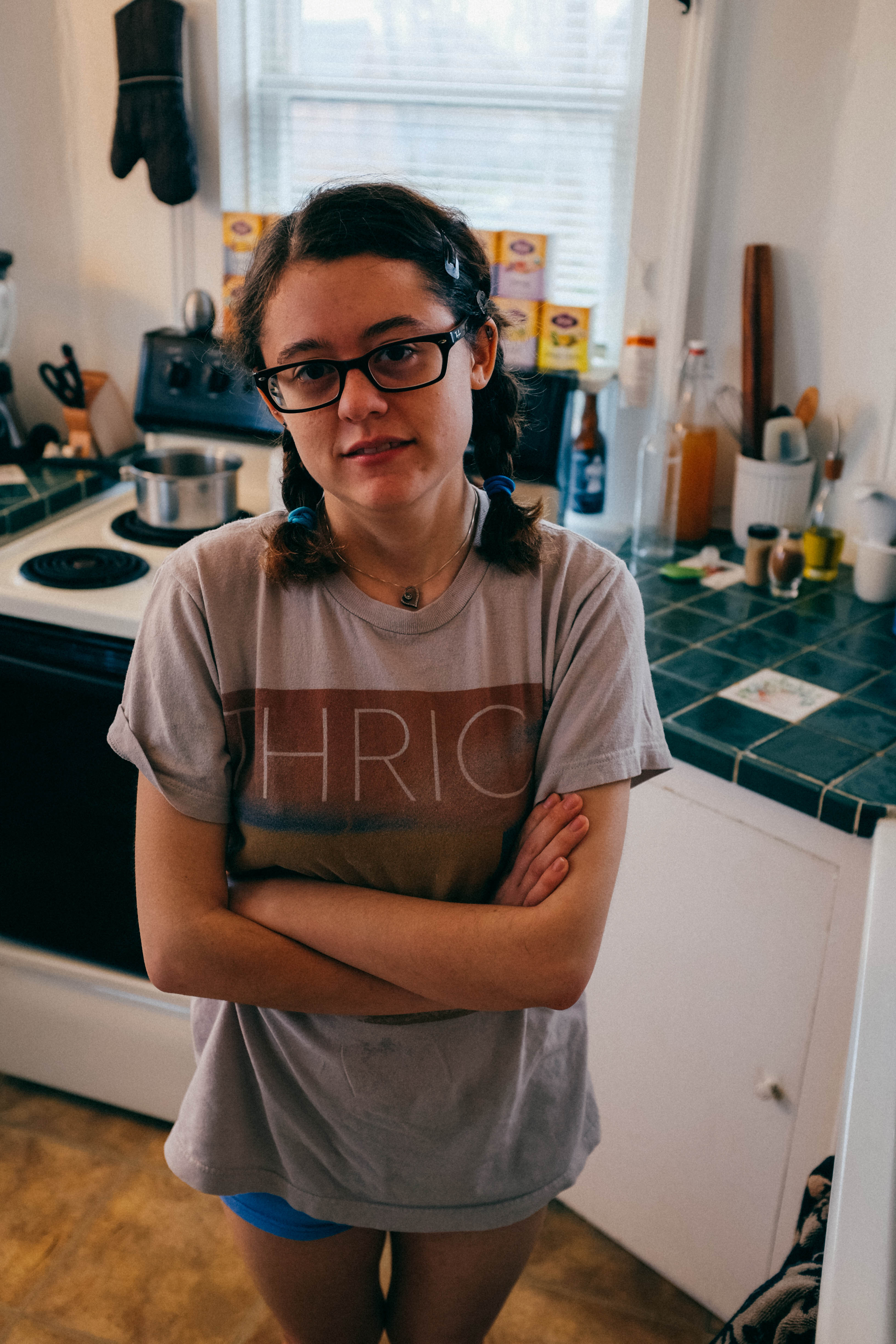 In a cozy kitchen setting, a young woman with glasses and braided hair stands with her arms crossed, exuding a mix of contemplation and casual resilience. The warm lighting captures the earthy tones of the room, while a cluttered counter and an inviting window suggest a lived-in atmosphere. Her simple attire and relaxed pose evoke a sense of comfort and authenticity.