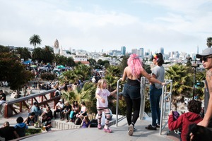The photograph captures a lively scene in a park filled with people, with a colorful palette reflecting a festive atmosphere. In the foreground, a woman with pink hair and a child walk hand-in-hand, framed by lush palms and the distant city skyline, evoking a sense of joy and connection. The bright, natural lighting enhances the cheerful mood, inviting onlookers to feel the energy of the moment.