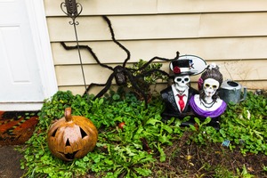 This photograph captures a festive Halloween display, featuring playful skull figurines dressed as a bride and groom, alongside a carved pumpkin and a looming artificial spider. The vibrant colors of the decorations contrast with the soft, muted tones of the wet ground and siding, creating a lively yet eerie atmosphere. The composition draws the eye to the central figures while the surrounding greenery adds an organic touch to the spooky scene.