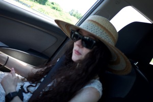 A woman sits in a car, partially illuminated by sunlight slicing through the windows. Her oversized straw hat and dark sunglasses create an air of chill nonchalance, while her long, curly hair cascades around her shoulders. The blurred greenery outside hints at movement, evoking a sense of adventure on a warm, sunny day.