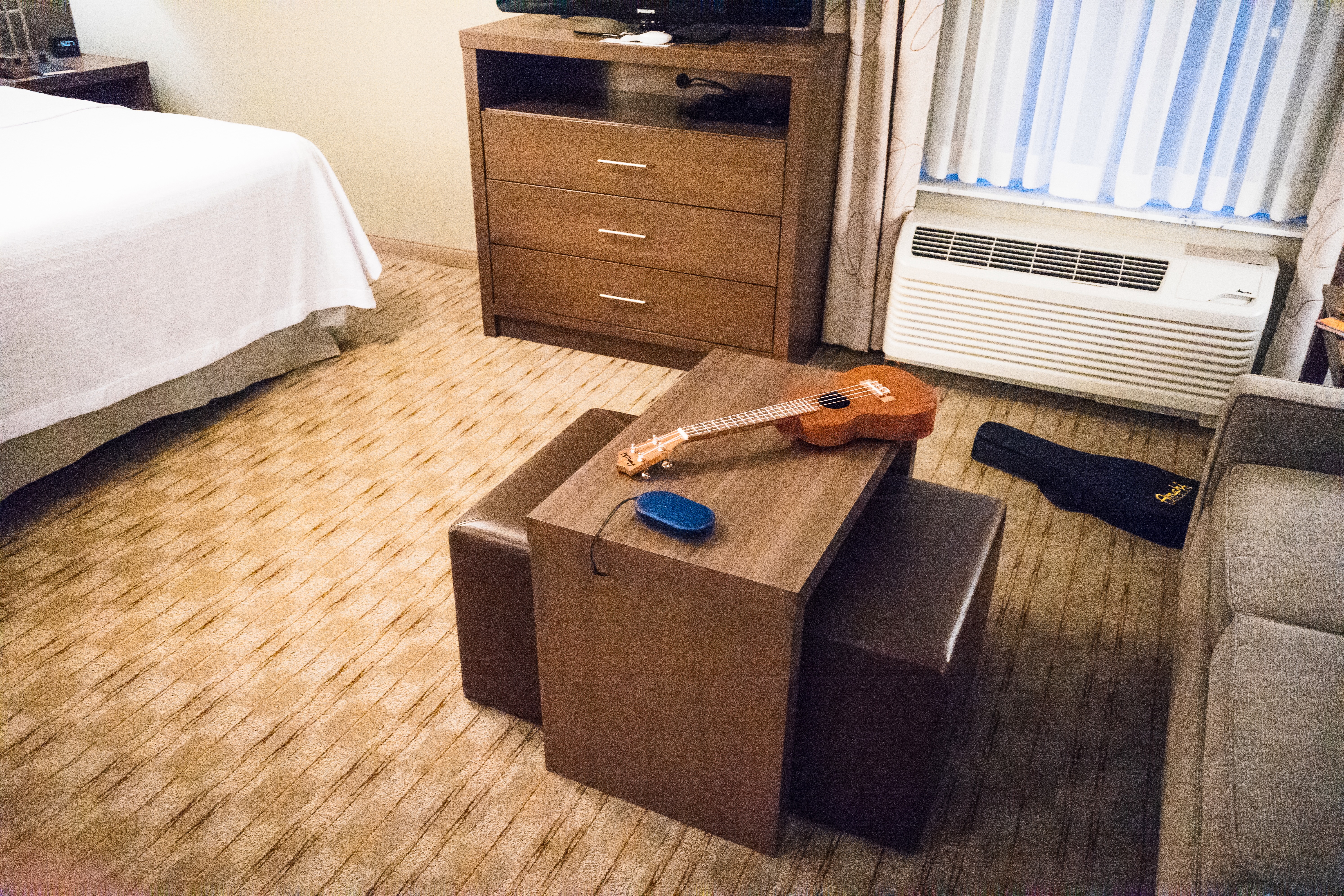 The photograph captures a cozy hotel room, featuring a simple wooden table with a ukulele resting on it, suggesting a moment of creativity amidst travel. The soft lighting drapes in through sheer curtains, casting a warm glow on the muted textures of the carpet and furnishings. A pair of closed drawers and a small sitting area hint at both comfort and solitude, evoking a sense of quiet introspection.