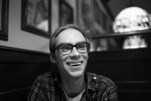 The photograph captures a man smiling warmly, seated in a cozy, intimate setting that hints at a restaurant or café. Soft, diffused lighting creates a joyful ambiance, while the blurred background, featuring vintage decor, enhances the feeling of nostalgia. The man’s glasses and plaid shirt give him a relaxed, approachable appearance, inviting viewers to share in his moment of happiness.