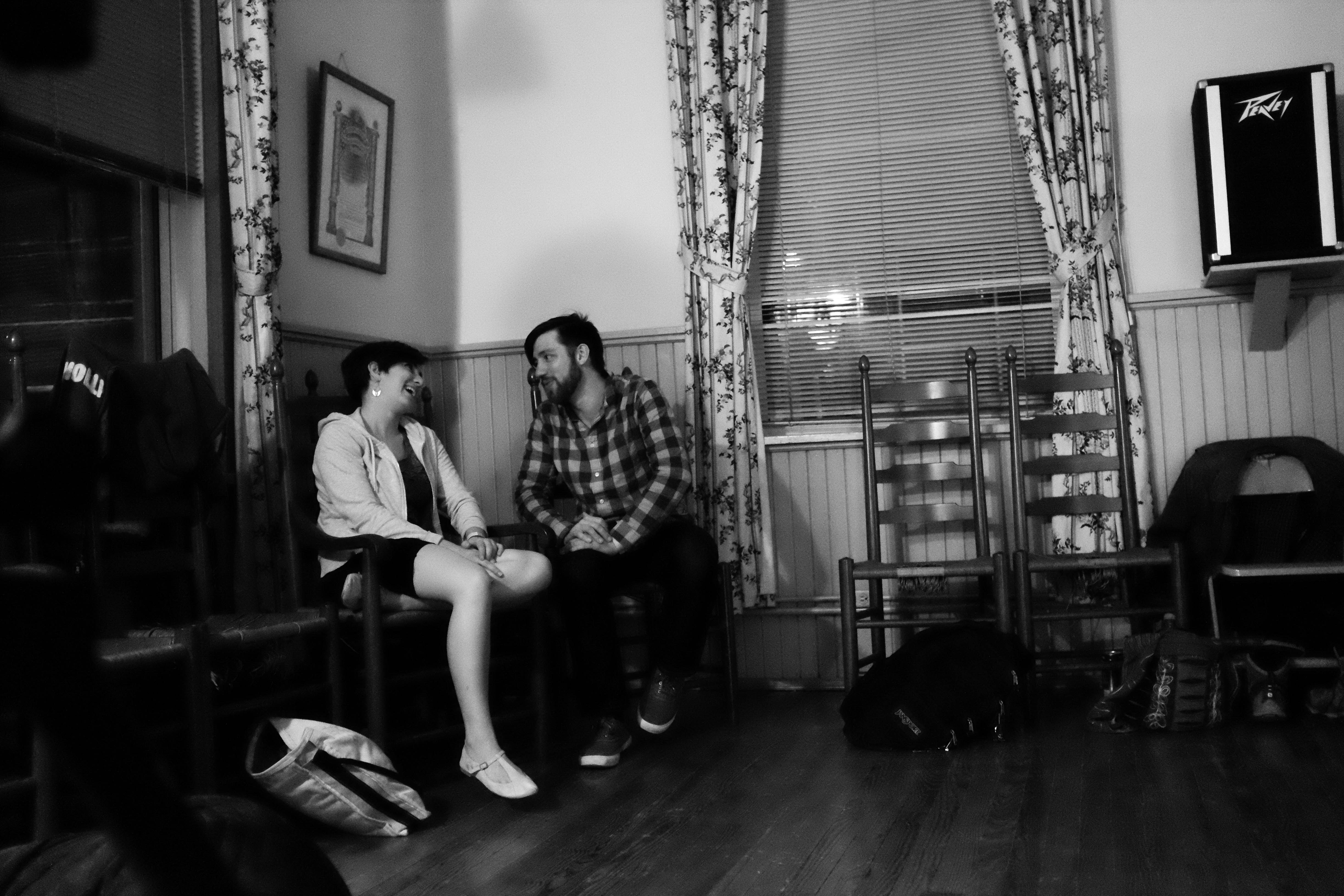 In this intimate black-and-white scene, a man and woman share a moment of connection, their smiles illuminating the dimly lit room. Surrounded by empty chairs and a sense of stillness, the soft light casts gentle shadows, enhancing the warmth of their interaction. The composition draws the eye to their closeness, evoking a mood of camaraderie and quiet joy in a seemingly forgotten space.