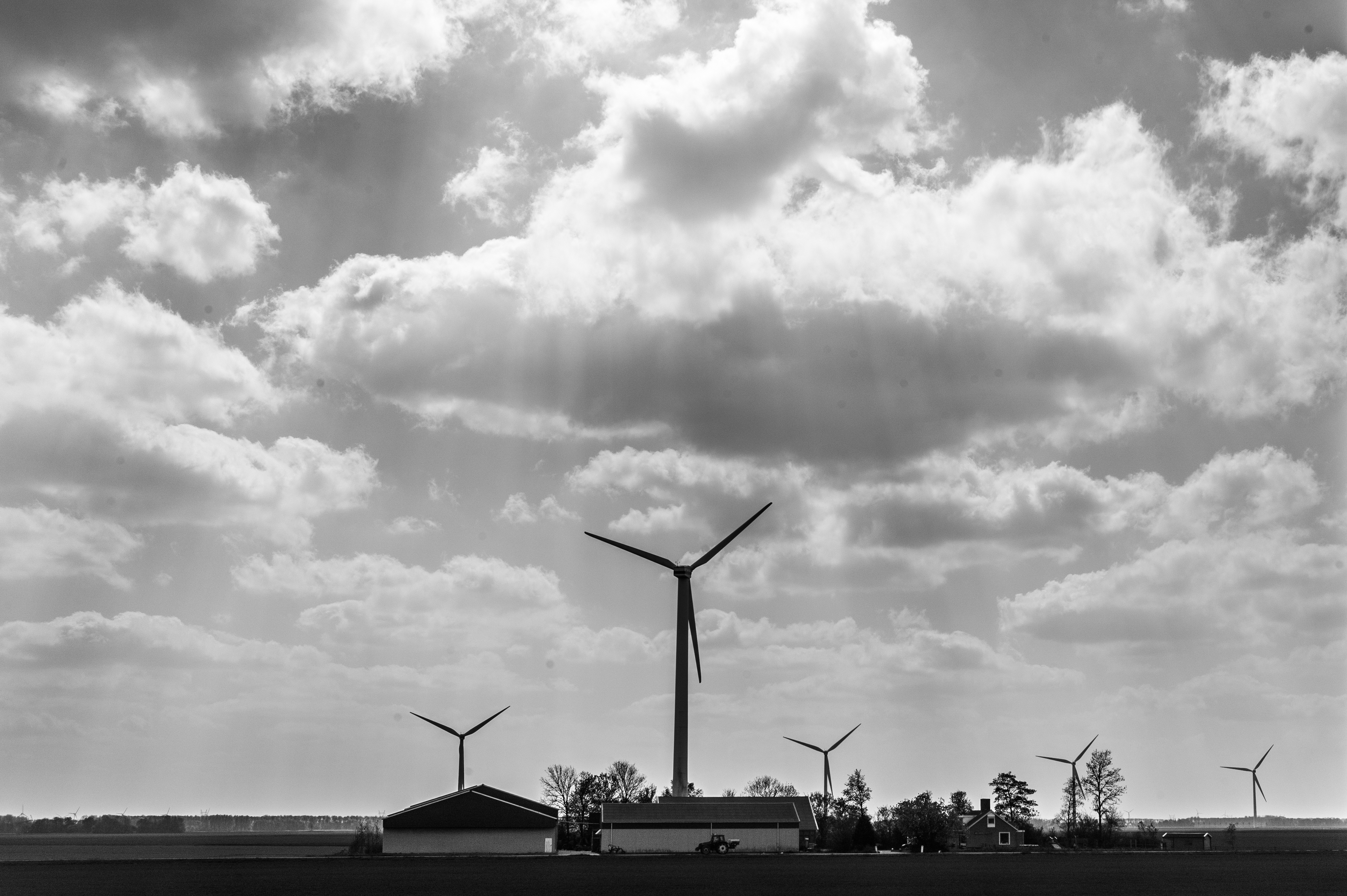 In a striking monochrome composition, towering wind turbines stand sentinel against a backdrop of dramatic clouds. The interplay of light and shadow casts an ethereal glow, enhancing the serene yet powerful mood of renewable energy sources amidst rural life. The gentle curvature of the landscape leads the eye toward the horizon, evoking a sense of harmony between nature and technology.