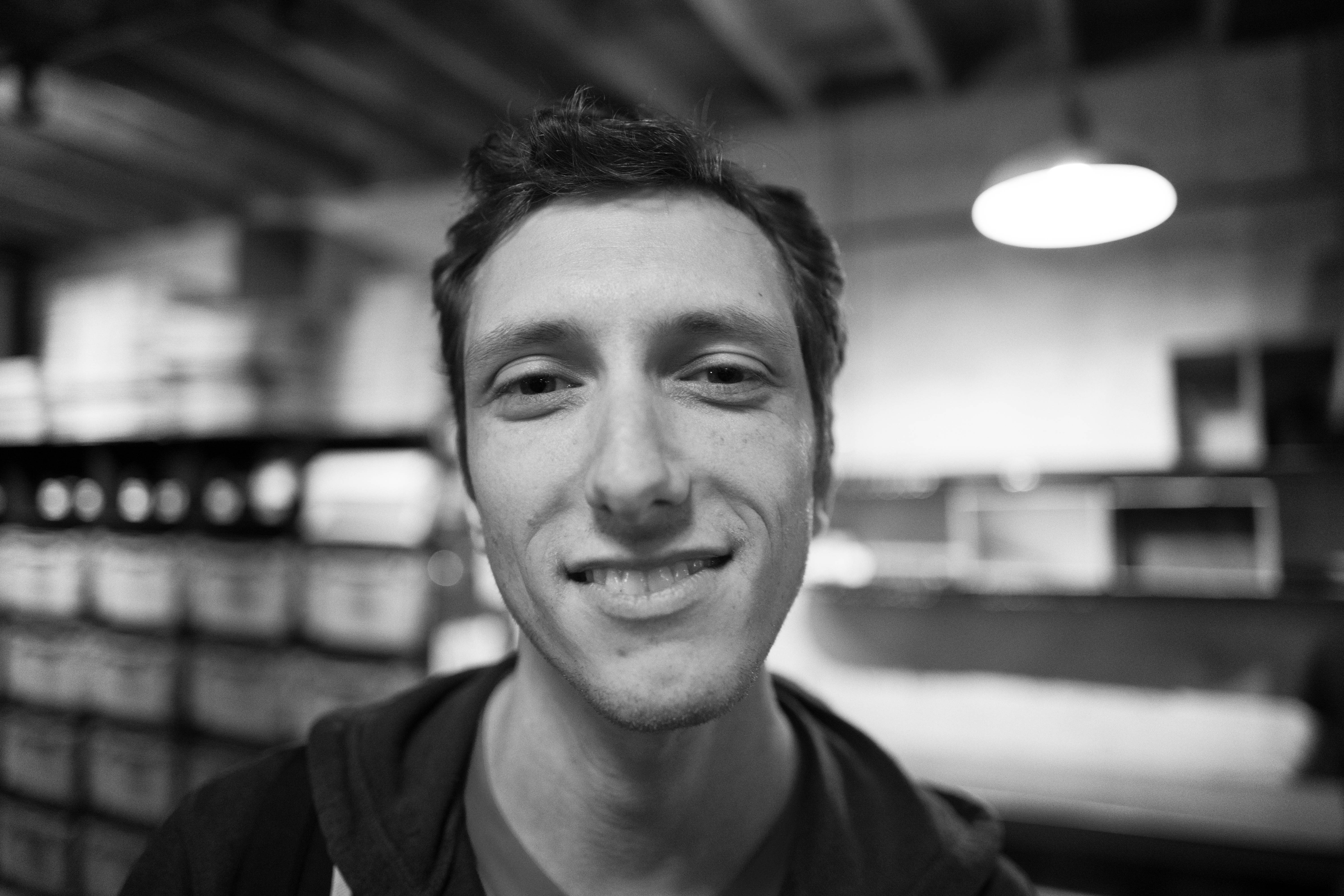 The photograph captures a candid moment of a young man smiling gently, set against a softly blurred background that hints at an industrial space. The monochromatic tones emphasize the warmth of his expression, while the moody overhead lighting adds depth and character to the scene. This interplay of light and shadow creates an inviting, intimate atmosphere.