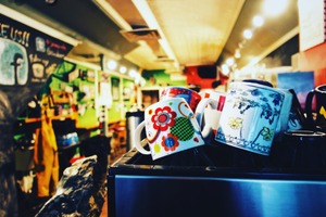 The photograph captures a vibrant selection of patterned mugs perched on a counter, bringing an inviting and cozy atmosphere. Soft, warm lighting enhances the colorful designs while blurring the bustling café in the background, creating a sense of depth and liveliness. This composition invokes a sense of warmth and community, ideal for a relaxing coffee experience.