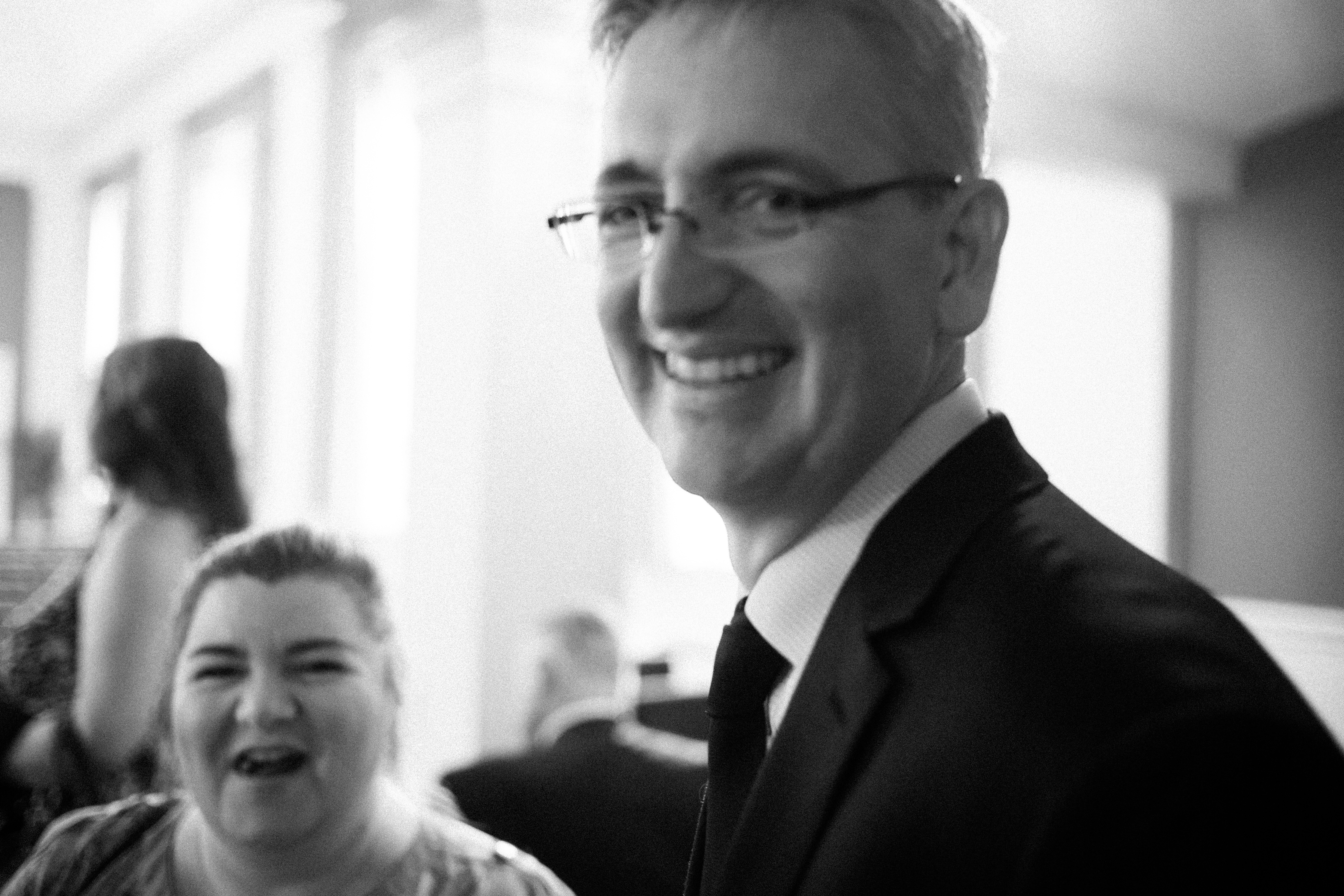 This black and white photograph captures a candid moment of laughter and connection between two people at a social gathering. The soft lighting enhances the warmth of their expressions, creating an inviting atmosphere, while the slightly blurred background suggests a lively event in progress.