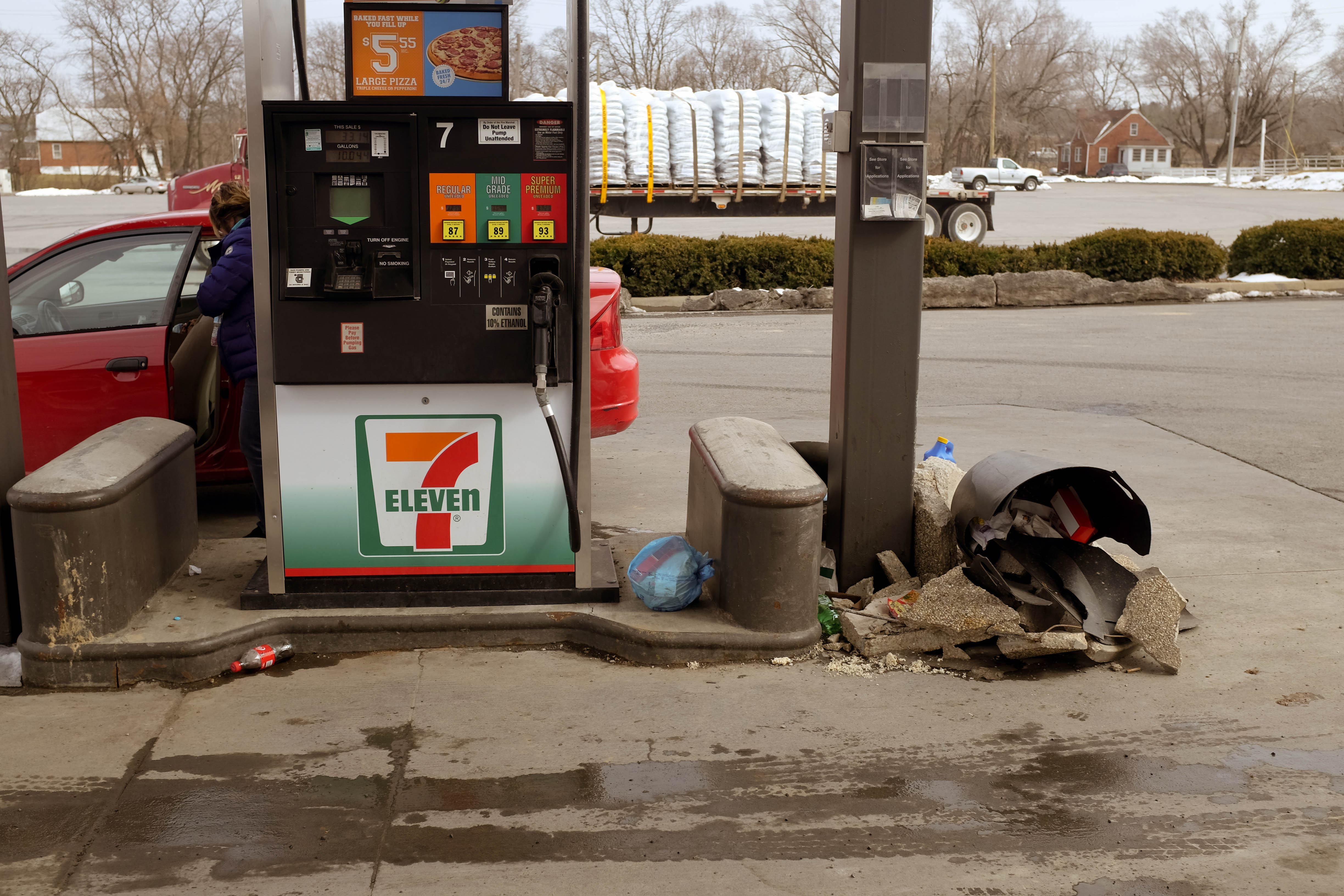 The photograph captures a quiet moment at a gas station, highlighting a 7-Eleven fuel pump adorned with vibrant green and red buttons. A female figure, partially obscured by her purple jacket, is seen engaging with her red car, adding a human element to the scene. The lighting is soft and natural, lending a somber mood to the image, especially with scattered debris and the stark landscape in the background.