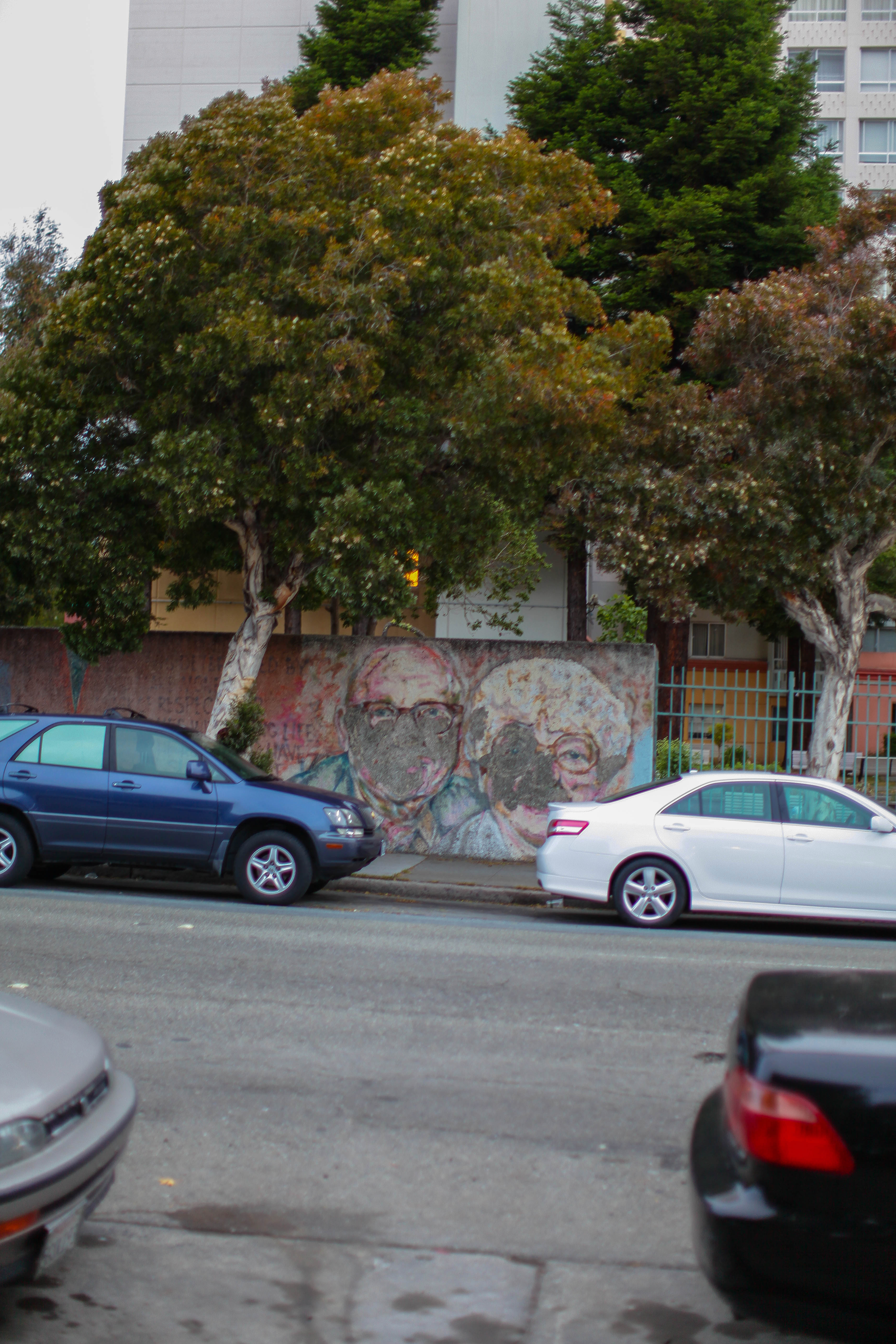 This photograph captures a vibrant mural featuring two faces, partially obscured by lush trees, set against the backdrop of an urban landscape. The composition cleverly juxtaposes nature and art, with the muted light of dusk creating a tranquil yet nostalgic mood. The parked cars add a sense of everyday life, while the colorful mural invites curiosity about the stories behind the depicted subjects.