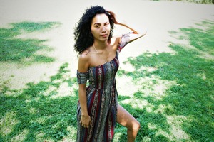 The photograph captures a young woman standing gracefully on a lush green lawn, her flowing patterned dress reflecting a bohemian spirit. The sunlight filters through the trees, casting gentle shadows that enhance the serene mood. Her confident pose and soft expression invite a sense of relaxed beauty in this tranquil outdoor setting.