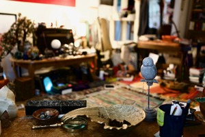 This photograph captures a vibrant and eclectic study filled with various ornaments and artifacts. The softly diffused light creates a warm, inviting atmosphere, highlighting the intricate details of the foreground objects like the owl figurine and the decorative leaf. The cluttered yet harmonious arrangement evokes a sense of creativity and personal expression, suggesting a space rich with stories and inspirations.