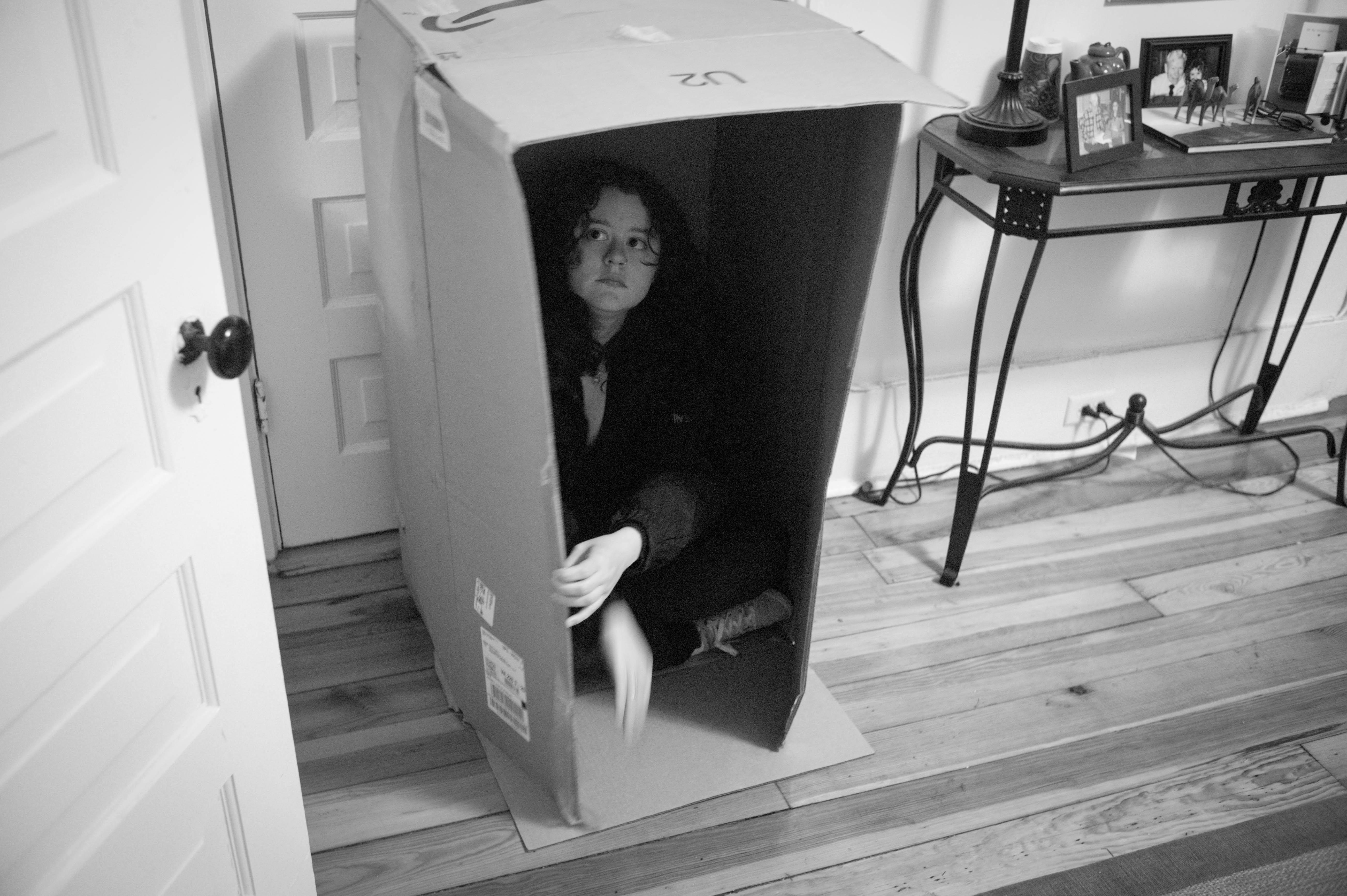 In stark black and white, a young person sits curled inside a cardboard box, their expression contemplative and distant. The simplicity of the space, accented by an open door and a nearby table of photographs, amplifies a sense of isolation combined with introspection. The soft, diffused light casts gentle shadows, enhancing the mood of solitude and introspective thought.