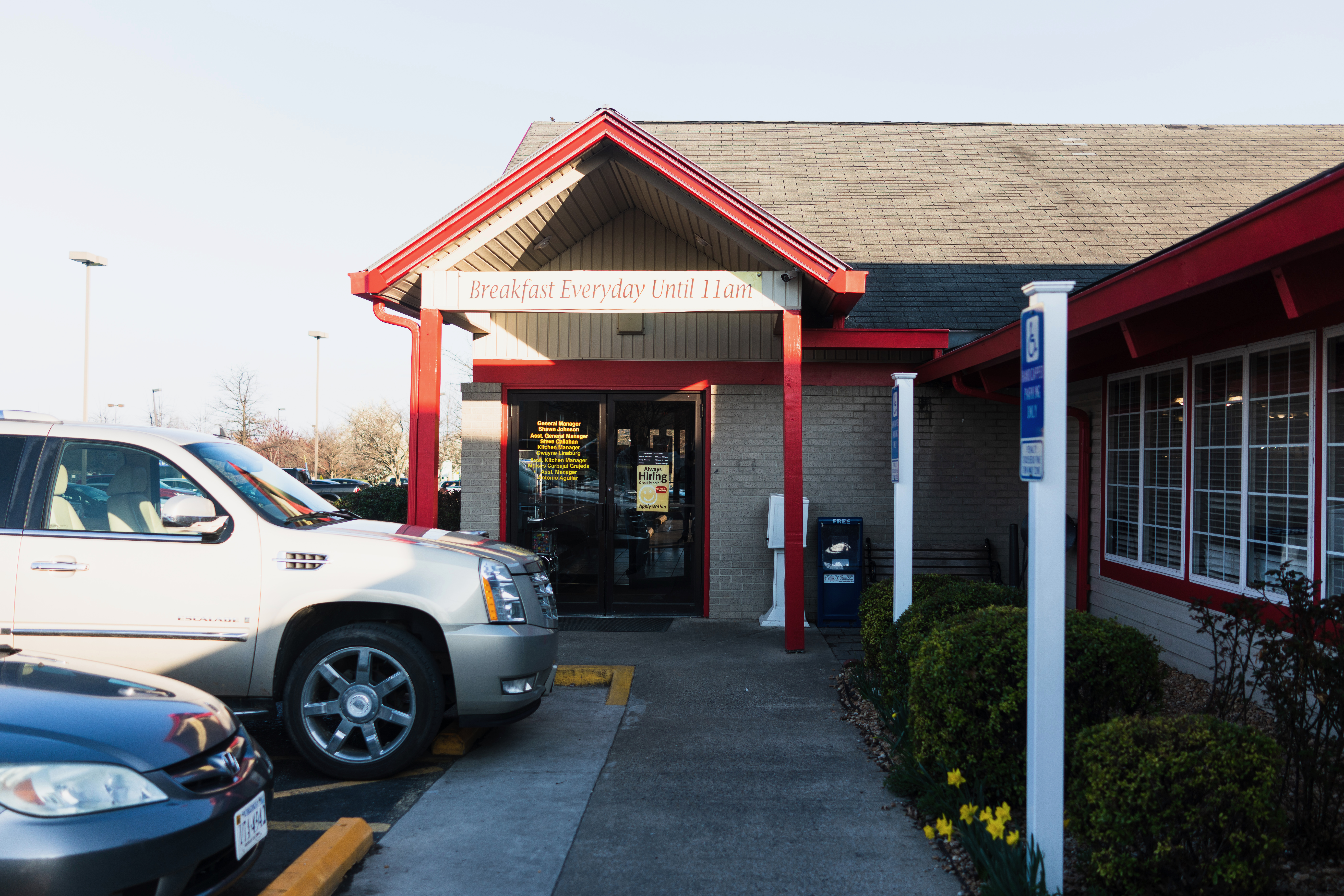 The photograph captures the inviting entrance of a cozy restaurant, framed by smartly parked cars and lush green landscaping. Warm sunlight bathes the scene, enhancing the cheerful sign proclaiming 'Breakfast Everyday Until 11 am,' creating a welcoming atmosphere that invites patrons to start their day. The composition balances the architectural lines with the surrounding flora, conveying a sense of friendly accessibility.