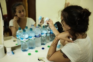 In a softly lit room, a woman gazes thoughtfully into a mirror, surrounded by a collection of water bottles. Her expression hints at introspection, as she examines small containers held delicately in her hands. The composition captures a moment of solitude and self-reflection, illuminated by the warm glow of the ambient light.