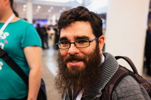 The photograph captures a man with a prominent beard and glasses, showcasing a warm smile amidst a blurred crowd. Soft, diffused lighting highlights his features, creating an inviting atmosphere that contrasts the busy background. The close-up composition draws attention to his expression, making him the focal point in a vibrant setting.