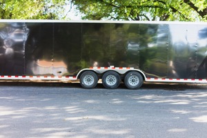 A sleek, black trailer stands silently against a backdrop of lush green foliage. The play of light creates a reflective surface that contrasts with the rough texture of the pavement, evoking a sense of stillness and anticipation. The composition draws the eye to the harmonious balance between the trailer's industrial form and the natural surroundings.