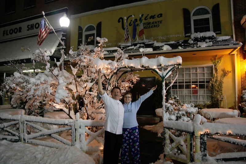 In front of a charming Italian restaurant adorned with snow, two figures joyfully raise their arms, embracing the wintry night. The warm glow from the restaurant contrasts beautifully with the cold, snowy landscape, creating a cozy, inviting atmosphere. Flags subtly flutter in the background, adding to the scene's festive mood.